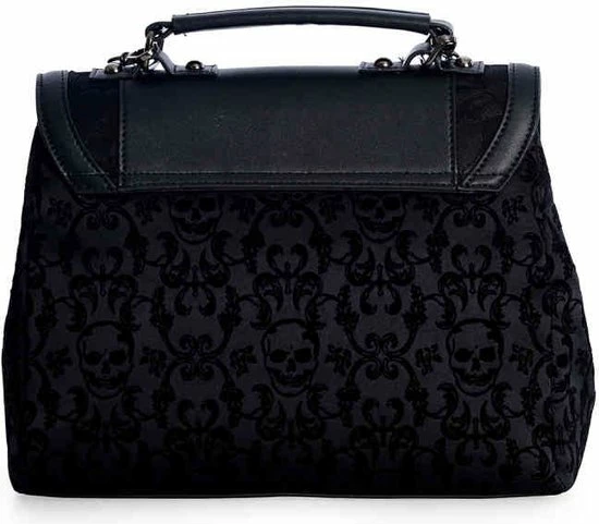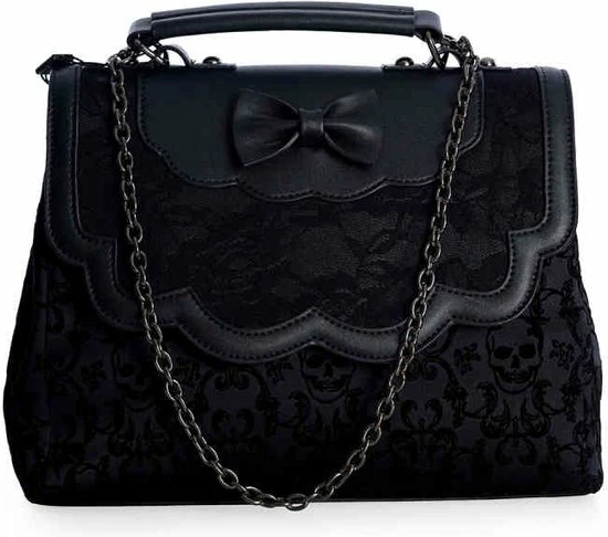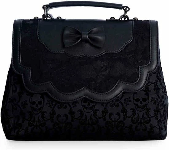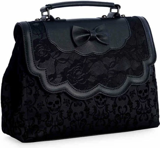 Handtas met schedel en bloemenprint. De flap bestaat uit kant met rozen en een strik.