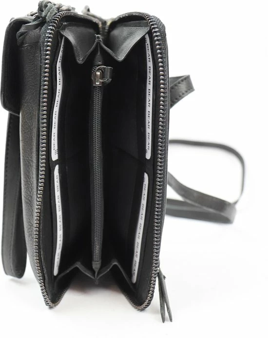 Mooi leren telefoontasje uit de Callisto Pelle serie van Bear Design. Het tasje is afsluitbaar middels een klep met drukknoopsluiting. In dit tasje past een telefoon van maximaal 8 x 16 cm. Op de achterzijde zit een ritsvak met binnenin: 2 vaksverdeling (tussenschot is een ritsvakje), 2 brede steekvakken en 8 sleufjes voor pasjes. Helemaal achterop zit een ritsvak voor bijv. muntgeld. Deze tas is als het ware een combinatie van een ritsportemonnee met een telefoonsteektasje. Super handig dus ook voor als je bijv. naar een festival gaat of als je de deur uit gaat en alleen je hoognodige items mee wilt nemen. Met de lange, afneembare en en verstelbare schouderband draag je dit tasje op de door jou gewenste lengte over de schouder of schuin over het lichaam (crossbody). Ook zit bij dit tasje een afneembaar polsbandje zodat je hem ook als clutch aan/in je hand kunt dragen.