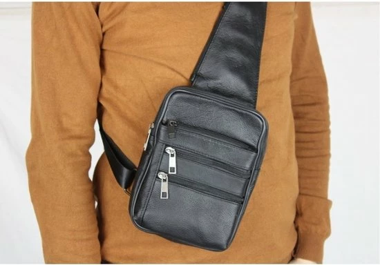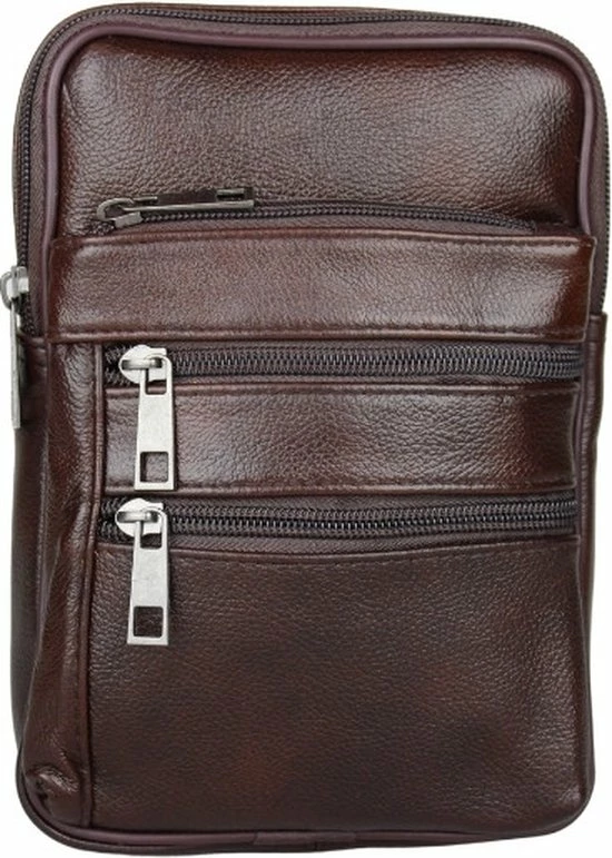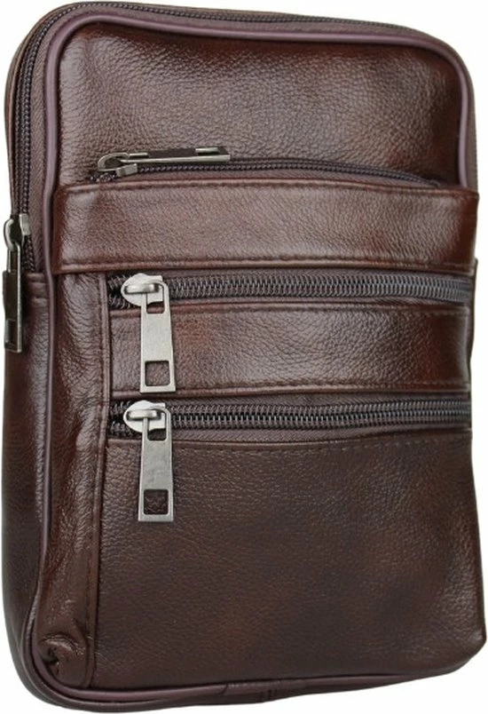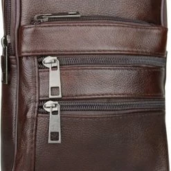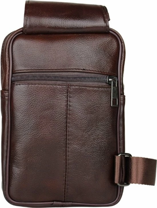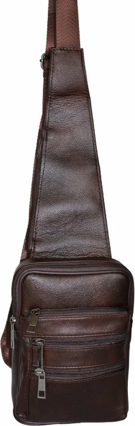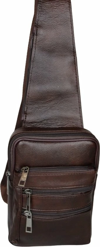 Leren schuine schoudertas/rugzak in het bruin. Handige tas voor heren, te gebruiken voor de rug of aan de voorzijde. De crossbody tas is gemaakt van echt leer, waardoor dit soepel en duurzaam is. De tas heeft een hoofdvak en 3 kleinere vakken aan de voorzijde. Er is een vak met rits aan de achterzijde, wat niet zichtbaar is. Tevens bevindt zich een vak met rits aan de bovenzijde van de schoudertas, dit is super handig. Dit is een tas om mee te nemen naar vakantie, of dagelijks gebruik. Zo heb je alles dus: portemonnee, telefoon, sleutels, paspoort etc op één plek. Dit kan eventueel onder de jas gedragen worden dus niet zichtbaar, erg veilig!