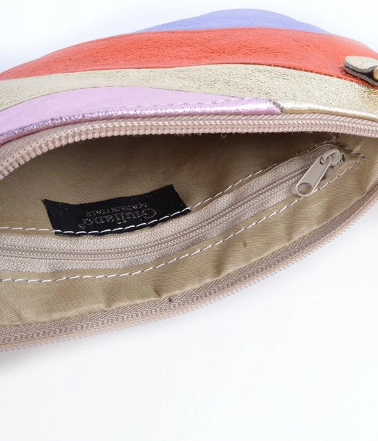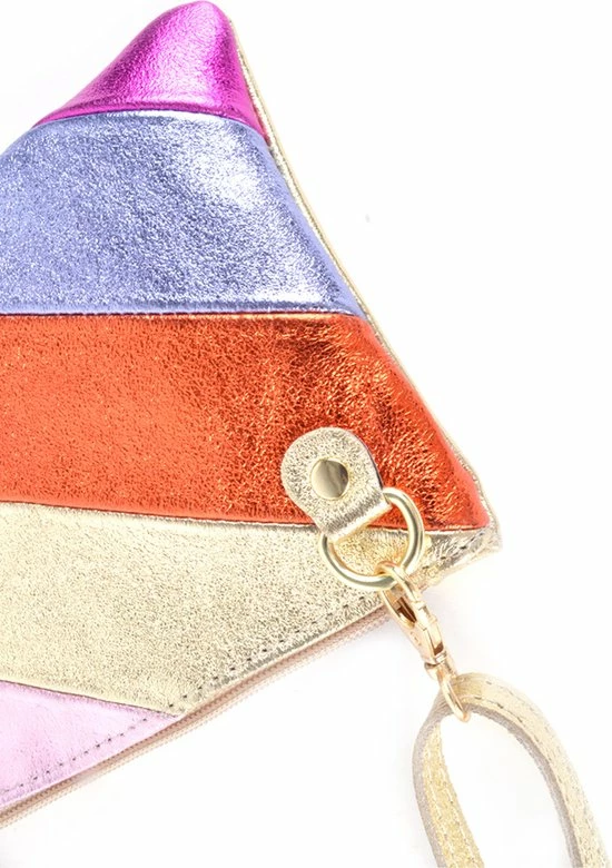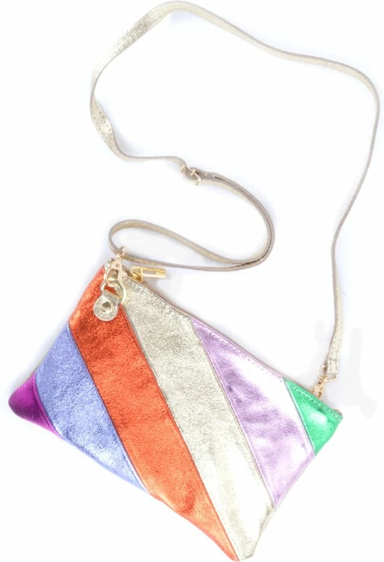 Rainbow Metallic Schoudertas/Clutch gemaakt van echt leer met een metallic laagje. Deze tas kan je op 2 manieren bij je dragen, als clutch en als schoudertas. De voorkant heeft een streepjes motief en de achterkant heeft 1 kleur.