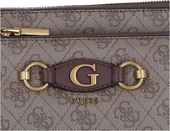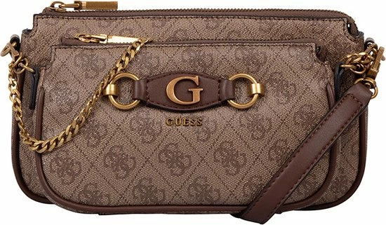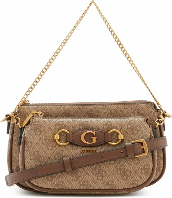 Guess Izzy Double Pouch dames schoudertas. Deze tas bestaat uit twee aparte tasjes die aan elkaar vast gemaakt kunnen worden, en daardoor zijn er veel kleine vakken om al je spullen in kwijt te kunnen. Het buitenmateriaal is uitgevoerd in kunstleer met logoprint op de buitenzijde en goudkleurige details. De binnenkant is gevoerd met polyester en de grotere tas is voorzien van een binnenvakje die met een rits afsluitbaar is. Afmetingen kleine tas: 11 x 2,5 x 20 cm. Afmetingen grote tas: 13 x 4,5 x 25 cm.