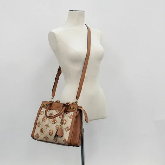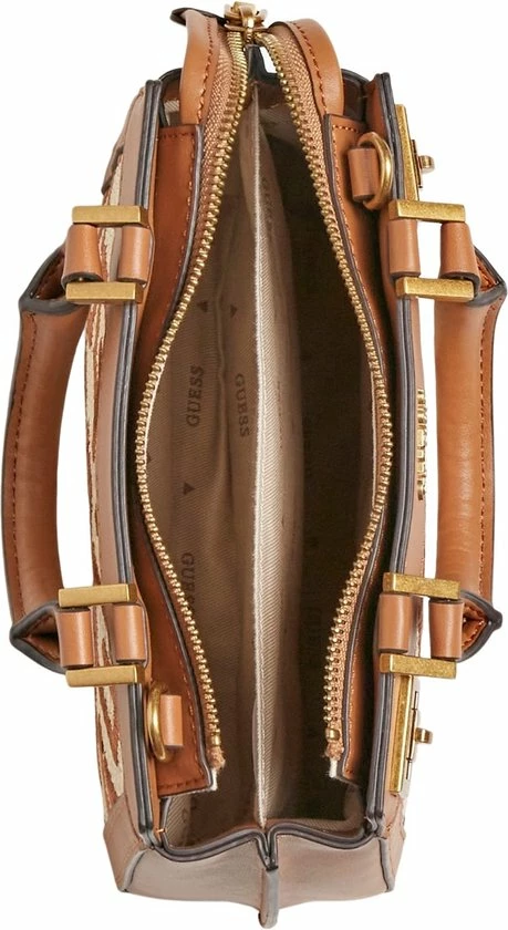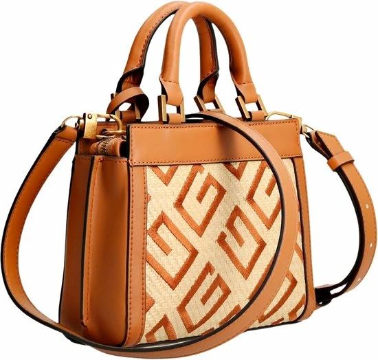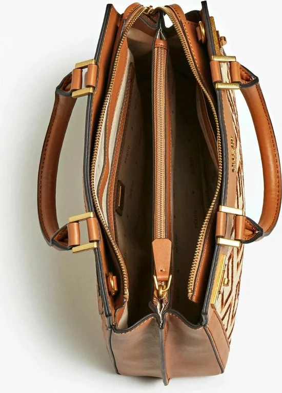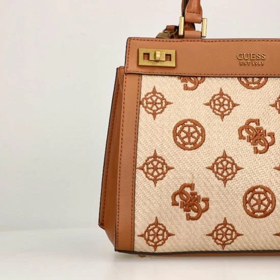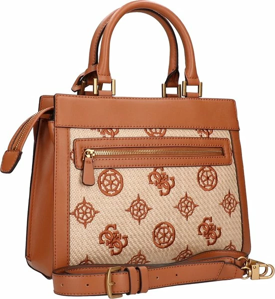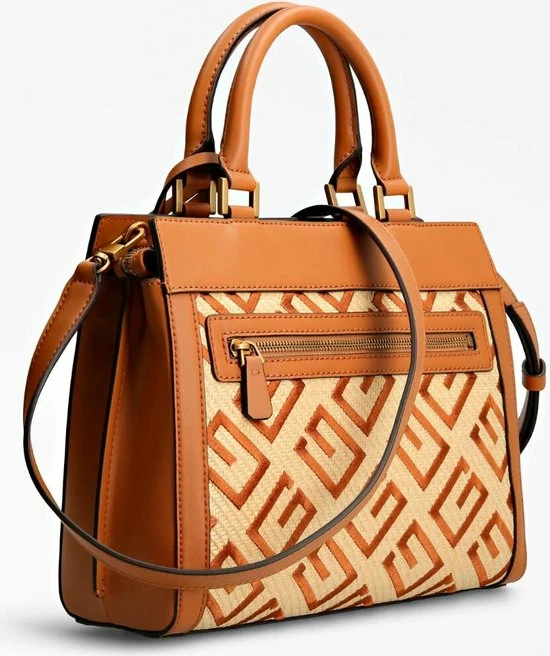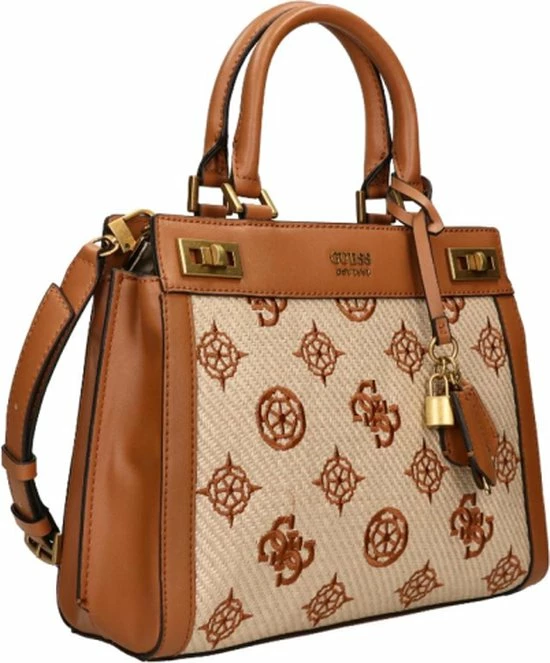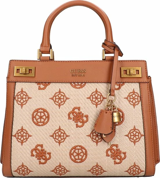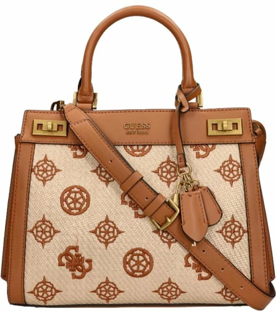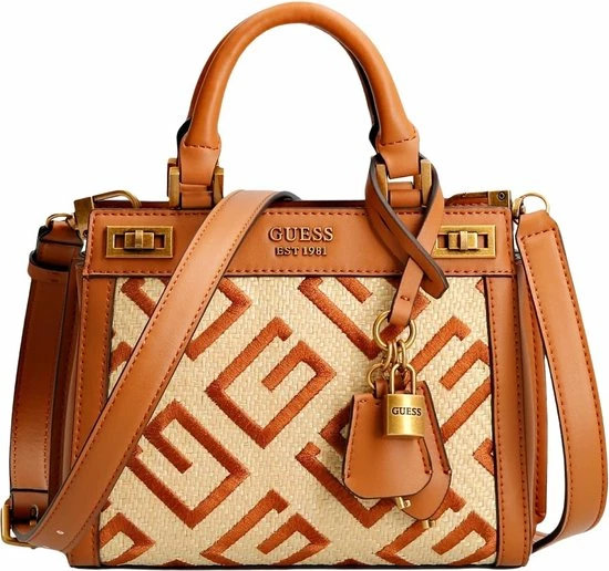 De Katey collectie van Guess krijgen echt hun charme door het gevlochten materiaal met geborduurde merkprint, waarvan de tassen gemaakt zijn. Verder heeft deze tas leren randen en draaghengsels. Dit model heeft een leuke hanger met een slotje en met leer gedecoreerde sleuteltjes. Inbegrepen bij deze tas is een verstelbare en afneembare schouderband.