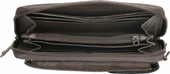 - Ritsvak achterop (ritsportemonnee) met binnenin 3 vaks verdeling, 2 steekvakken, 8 sleufjes voor pasjes en ritsvak voor muntgeld