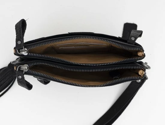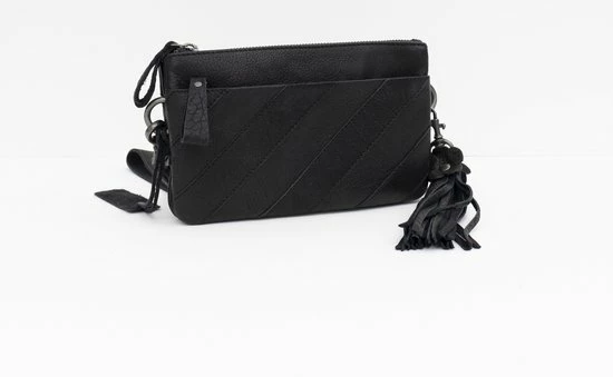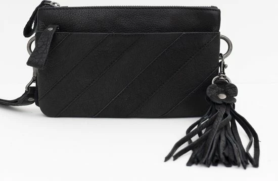 Een verrassend ruim leren schoudertasje met sierstiksel, clutch van Bag2Bag uit de serie Gaya. Het tasje is gemaakt van prachtig leer. Het leer voelt heel prettig. Het tasje heeft een polsbandje en een fraaie sleutelhanger. Deze zijn beide afneembaar. Het tasje heeft heel veel opbergmogelijkheden. Drie ruime opbergvakken met hierin een zijvakje met rits en drie vakjes voor creditcards. Het tasje sluit met een rits. Aan de voor- en achterzijde van het tasje zit ook nog een opbergvak.