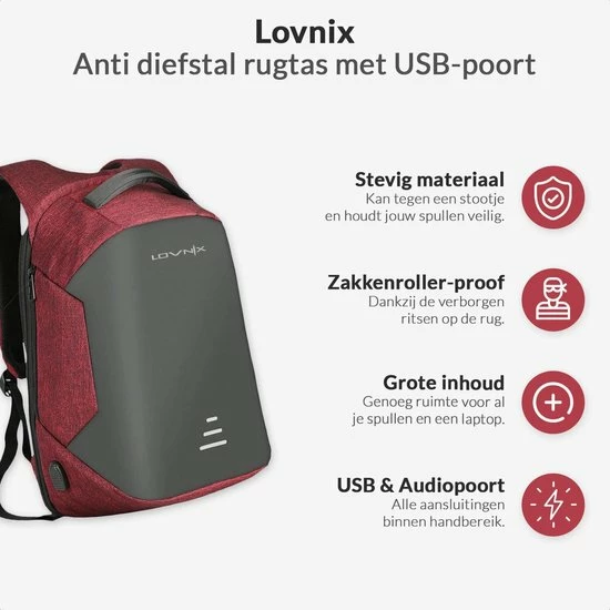 Elke dag bevinden zich wereldwijd veel zakkenrollers. Per dag zijn dit er gemiddeld 400.000. Met de anti-diefstal rugzak van Lovnix zal jij hier geen slachtoffer van worden. Het materiaal van deze tas is namelijk erg stevig, dus niet makkelijk op te snijden. Niet alleen is dit een voordeel, maar een andere eigenschap van deze tas is dat de ritssluiting op je rug zit. Dus mocht de tas open gemaakt willen worden, zul je dit ten alle tijd voelen. Verder heeft de rugzak reflecterende details, waardoor je goed zichtbaar bent in het donker. De tas is waterafstotend en heeft aan de buitenzijde een USB- en audioaansluiting. Ook heeft de rugzak aan de binnenzijde vele vakken en een apart vak voor een laptop of tablet van 15,6 inch.