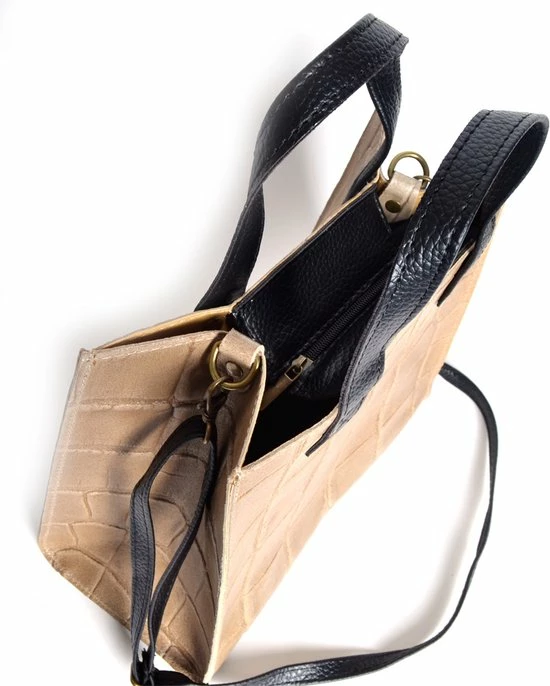 Lederen handtas icm kunstlederen handvat. Deze tas heeft een nylon voering en heeft een ritssluiting. Deze tas wordt ook geleverd met een afneembare en verstelbare lange schouderband.