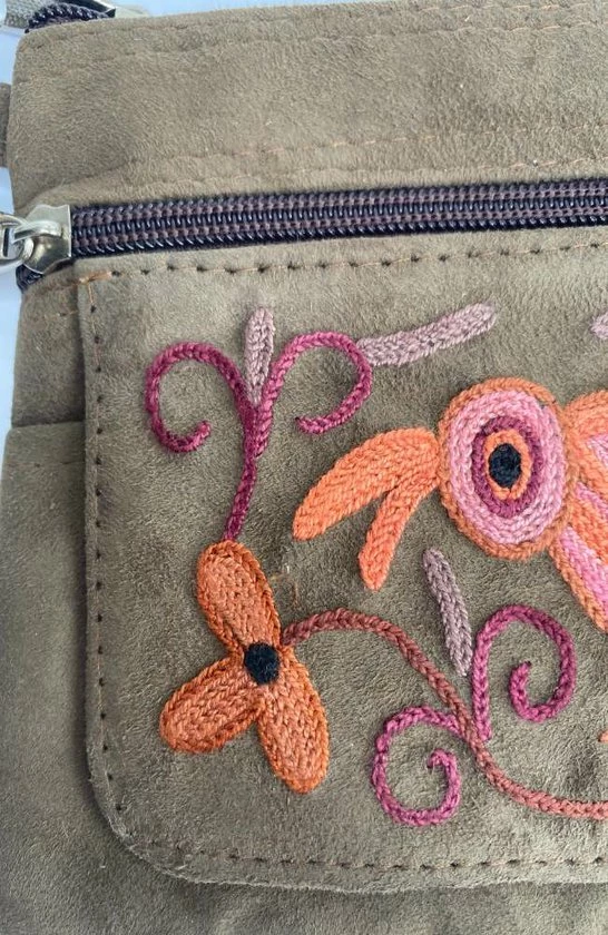 Polstas gemaakt van suède leer met handgeborduurd bloemenpatroon afkomstig uit Kashmir, India. Het is een stijlvolle tas voor dagelijks gebruik, perfecte maat voor je telefoon, make-up, paspoort en geld. Gebruik deze multifunctionele tas om je handtas te organiseren of aan je riem op reis. Tas is voorzien van een ruim ritsvak, zijritsvak en een steekvak met drukknoopsluiting.
