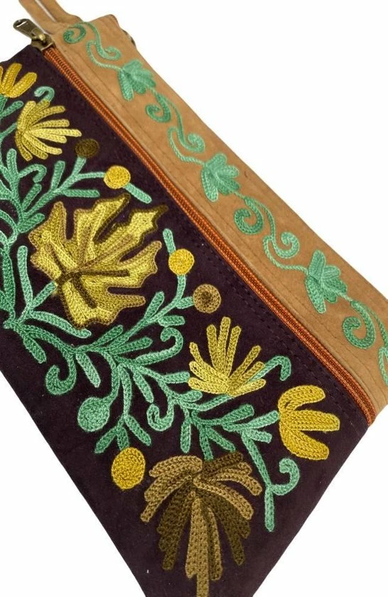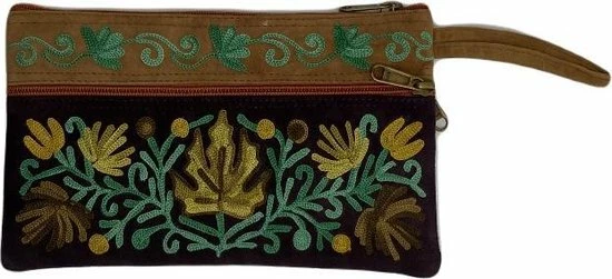 Dames polstas gemaakt van suède leer met handgeborduurd hennepplant patroon. Deze unieke polstas is verfraaid met prachtige handborduurwerk in Kashmir design. Het is een stijlvolle tas voor dagelijkse gebruik, perfecte maat voor je telefoon, make up, paspoort en geld. Gebruik deze multifunctionele tas om je handtas te organiseren of op reis. Tas is voorzien van een ruime ritsvak en twee zij ritsvakken.