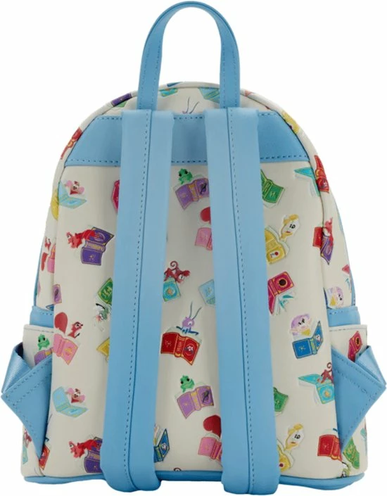 Rugtas Princess Books AOP. Prachtige kunstlederen tas uit de Disney-collectie van het Amerikaanse designermerk Loungefly. Op de voorvakje van de tas staat een stapel met vijf sprookjesboeken; Beauty & the Beast, The Little Mermaid, Sleeping Beauty, Cinderella en Snow White and the Seven Dwarfs. Het voorvakje heeft een ritssluiting. Op het hoofdvak van de tas staat een All-Over-Print met afbeeldingen van opengeklapte sprookjesboeken. In ieder boek zie je een bijbehorende personage uit het boek, zoals de kameleon Pascal uit Rapunzel, de krab Sebastiaan uit The Little Mermaid, het aapje Abu uit Aladdin, etc. De tas is verder voorzien van twee verstelbare schouderbanden en een bijpassende binnenvoering. (All-Over-Print betekent, dat de plaatsing van de afbeeldingen kan verschillen per tas. Aan de getoonde afbeelding kunnen geen rechten worden ontleend.)