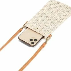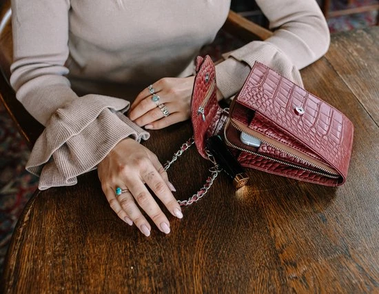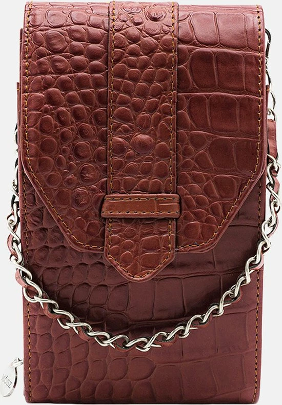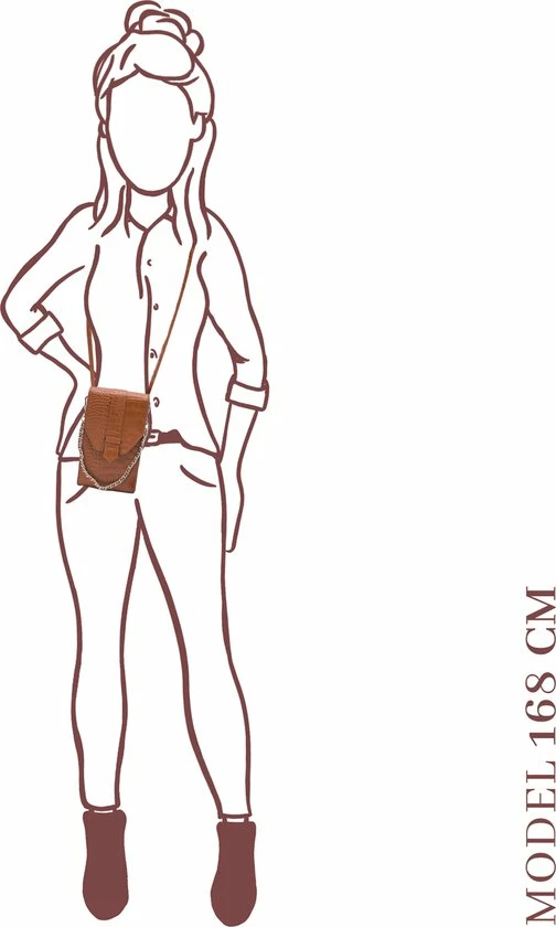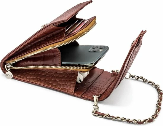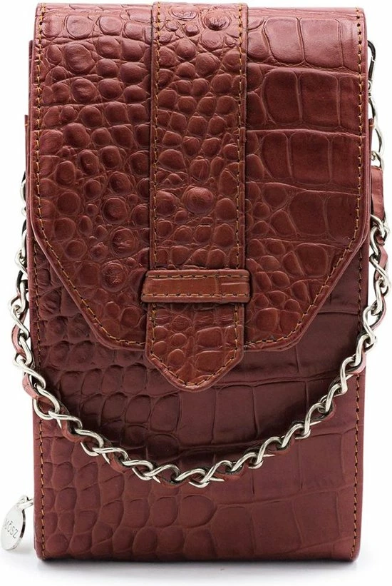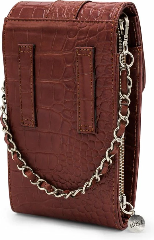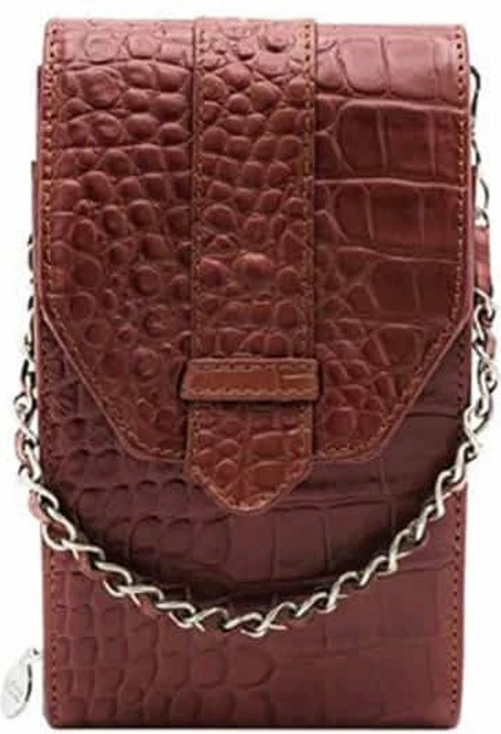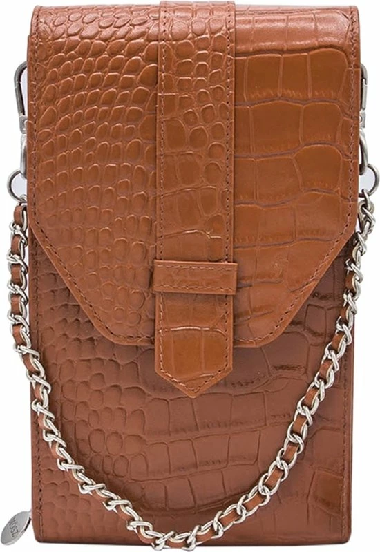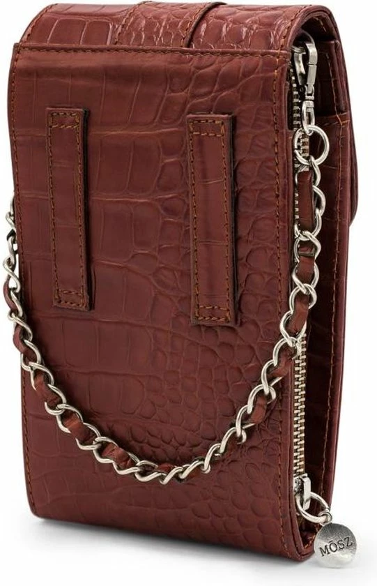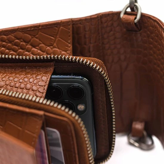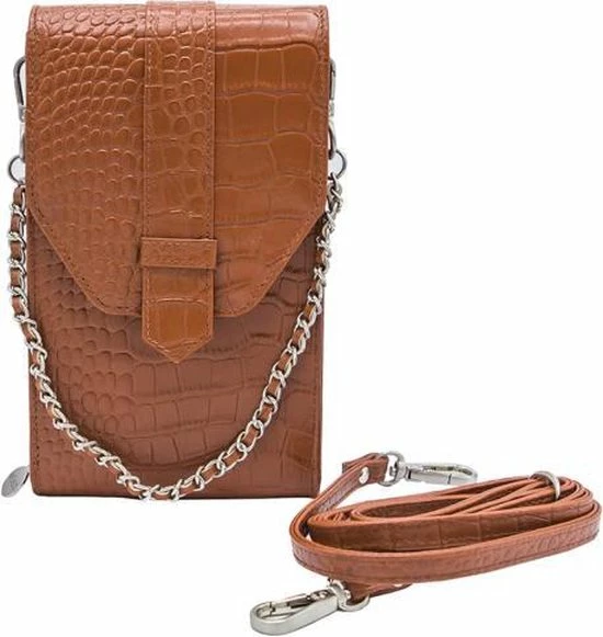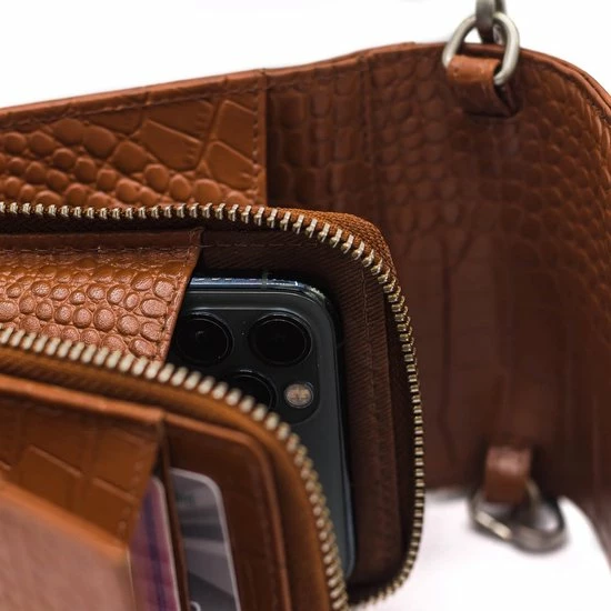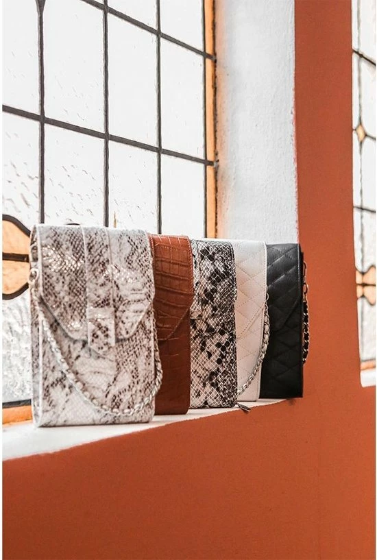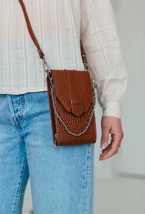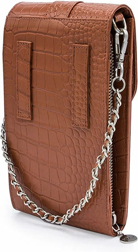 Het telefoontasje is op drie verschillende manieren te dragen. Crossbody dankzij de verstelbare en afneembare schouderriem, als handtas dankzij de korte schakelketting of met lusjes aan je riem (als een heuptas) te bevestigen.