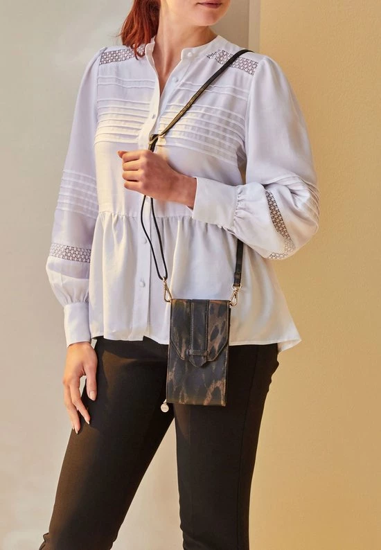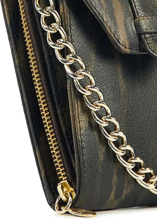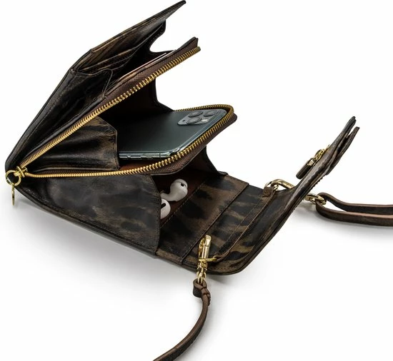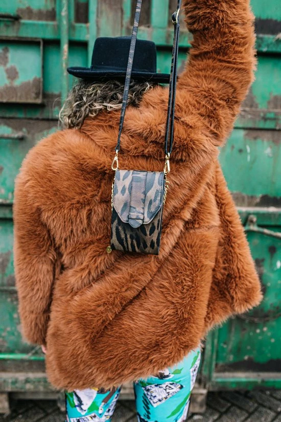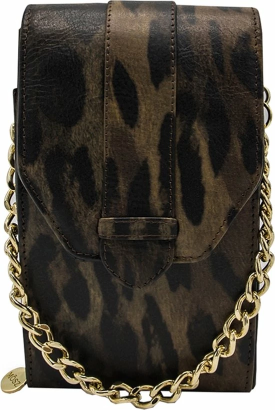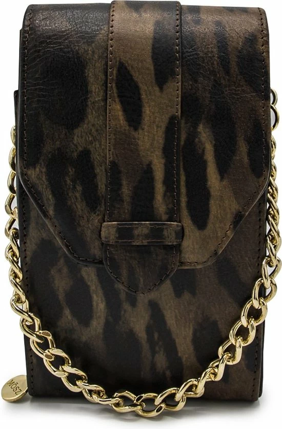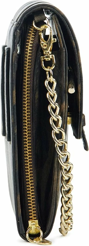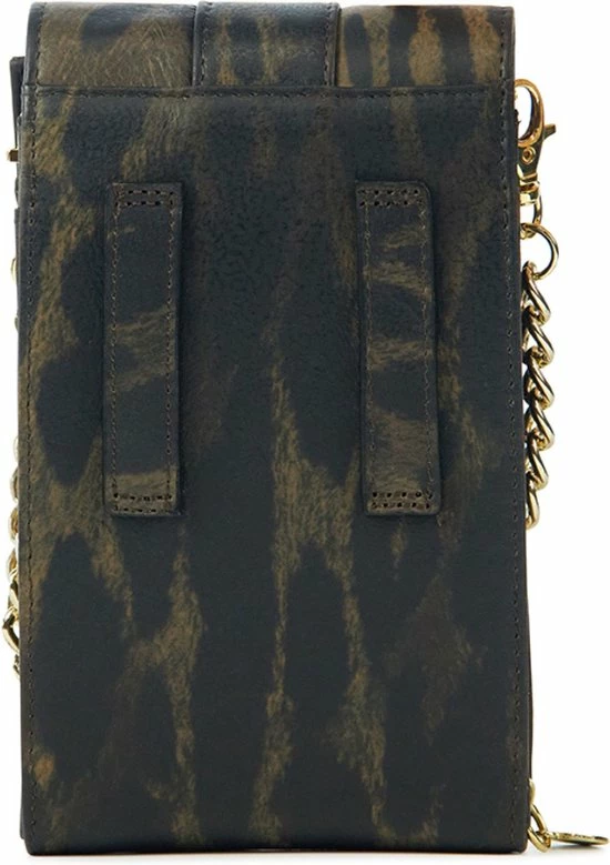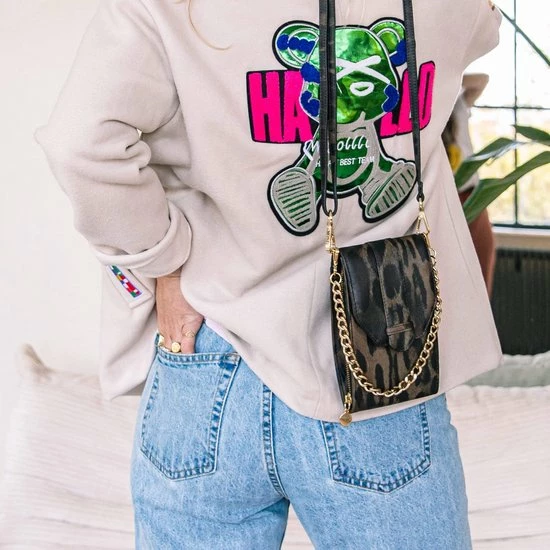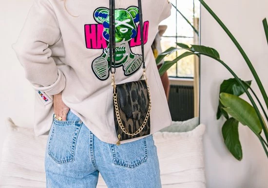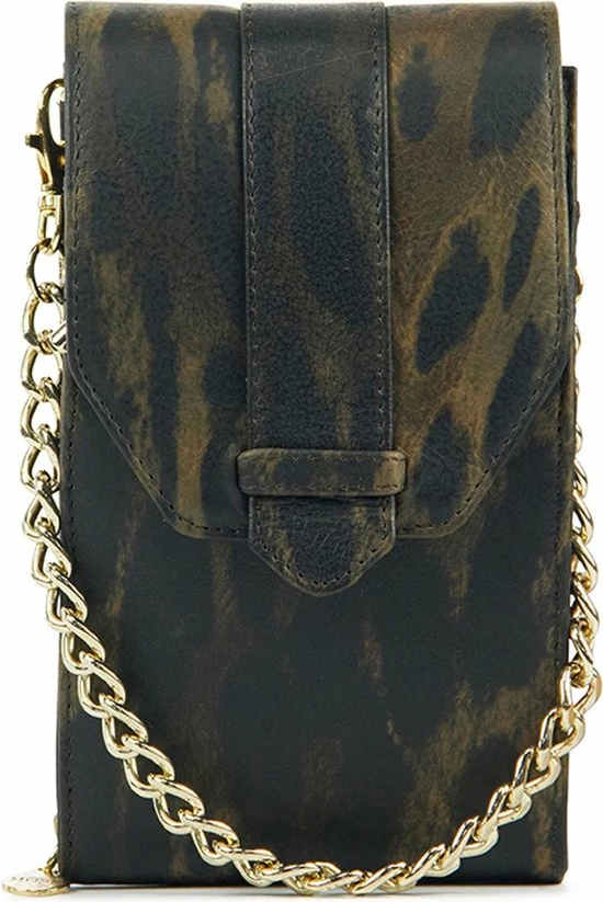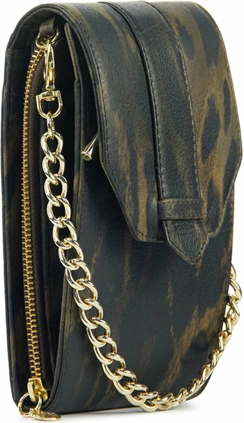 Het telefoontasje is op drie verschillende manieren te dragen. Crossbody dankzij de verstelbare en afneembare schouderriem, als handtas dankzij de korte schakelketting of met lusjes aan je riem (als een heuptas) te bevestigen.