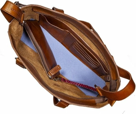 Wat heeft deze prachtige leren damestas nog meer te bieden ? Nou, nog best veel andere handige zaken die het gebruik erg prettig maken. De tas heeft een harde onderkant (ook verwijderbaar) in een mooie lichtblauwe contrastkleur. Dit zorgt ervoor dat de tas ook makkelijk kan blijven staan, een handigheidje wat vaak bij veel soortgelijke tassen van andere merken ontbreekt. Verder zitten er nog 2 vakjes aan de binnenkant om bijvoorbeeld een telefoon in te stoppen en nog 4 vakjes voor bankpasjes. En als laatste, maar zeker niet minder belangrijk, de tas kunt u aan de bovenzijde helemaal afsluiten met een rits over de volle lengte. Zo zijn uw eigendommen maximaal beschermt tijdens uw (stads) wandeling.