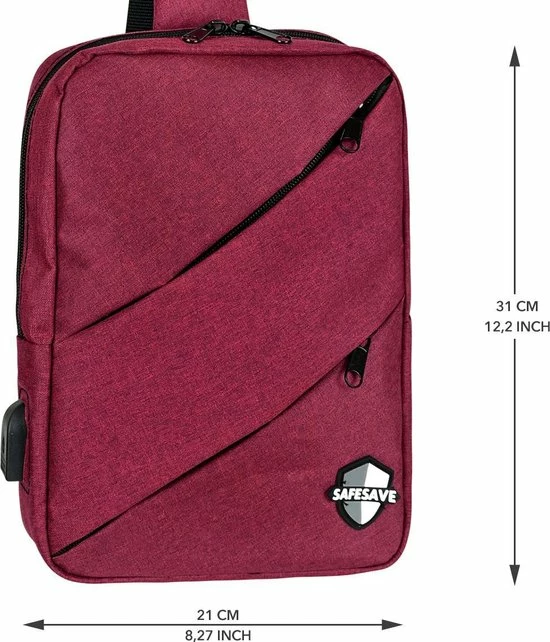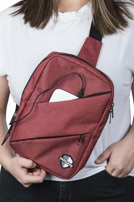 SafeSave staat voor inclusiviteit, diversiteit en kwaliteit. Deze slingbag is hier een mooi voorbeeld van. Gemaakt van hoogwaardig en waterdicht linnen is alles wat je vervoert in deze rugtas in ieder geval goed beschermd. De tas beschikt over een USB aansluiting en een apart vak om deze aan te sluiten op een powerbank (niet inbegrepen). Dankzij deze handige feature, kun je altijd en overal je telefoon of tablet opladen.