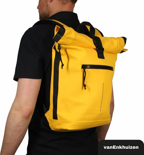 Neem je spullen overal mee naartoe in deze stijlvolle van Enkhuizen Rolltop Rugzak voor dames en heren. Maak de rugtas groter en kleiner door de sluiting op of uit te rollen. Het laptopvak biedt ruimte aan een 15,6 inch laptop, die droog blijft via het waterafstotende Tarpaulin. Houd je spullen warm of koud dankzij de thermo binnenzijde en gebruik de ritsvakken om kleine spullen weg te stoppen. Veilig de weg op in het donker is geen probleem door de reflectie strip op de rugzak. De gewatteerde schouderbanden zorgen voor ideaal draagcomfort, waardoor deze handige tas onmisbaar wordt.