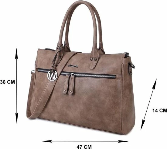 Afmetingen tas: 36 cm hoogte x 47 cm breedte x 14 cm dikte.