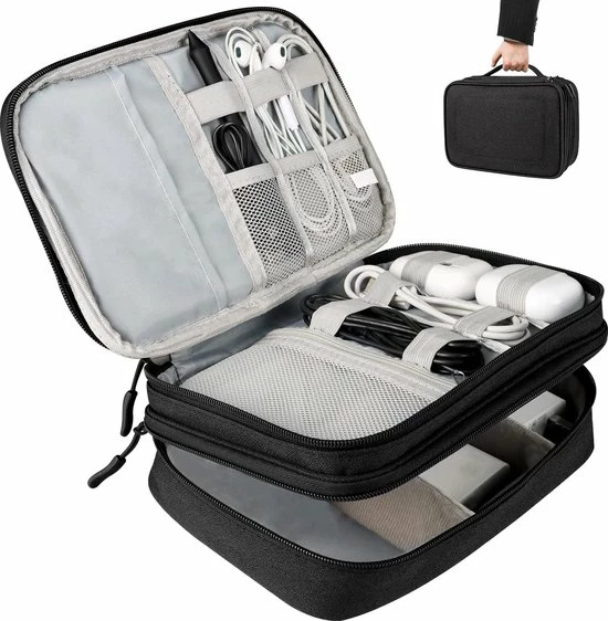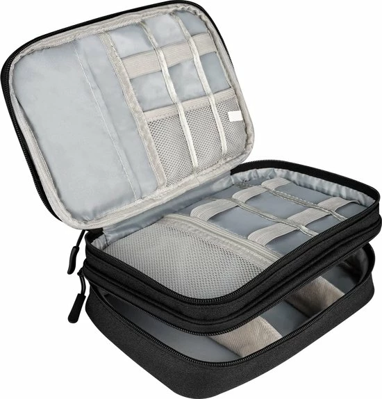 De tas is gemaakt van hoogwaardig materiaal en is waterafstotend. Verder heeft de organiser een handig handvat waarmee je gemakkelijk de tas in de hand kunt meenemen. Zo kun jij makkelijk en veilig al jouw elektronische accessoires vervoeren en opbergen!