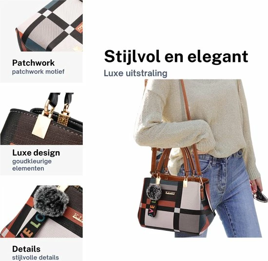 Deze stijlvolle tas heeft de volgende afmetingen 28 cm x 20 cm x 15 cm (lengte x hoogte x breedte). De onderzijde is voorzien van 4 metalen pootjes, waardoor de tas op iedere ondergrond stabiel en stevig staat. Het patchwork motief geeft de tas een tijdloos karakter.